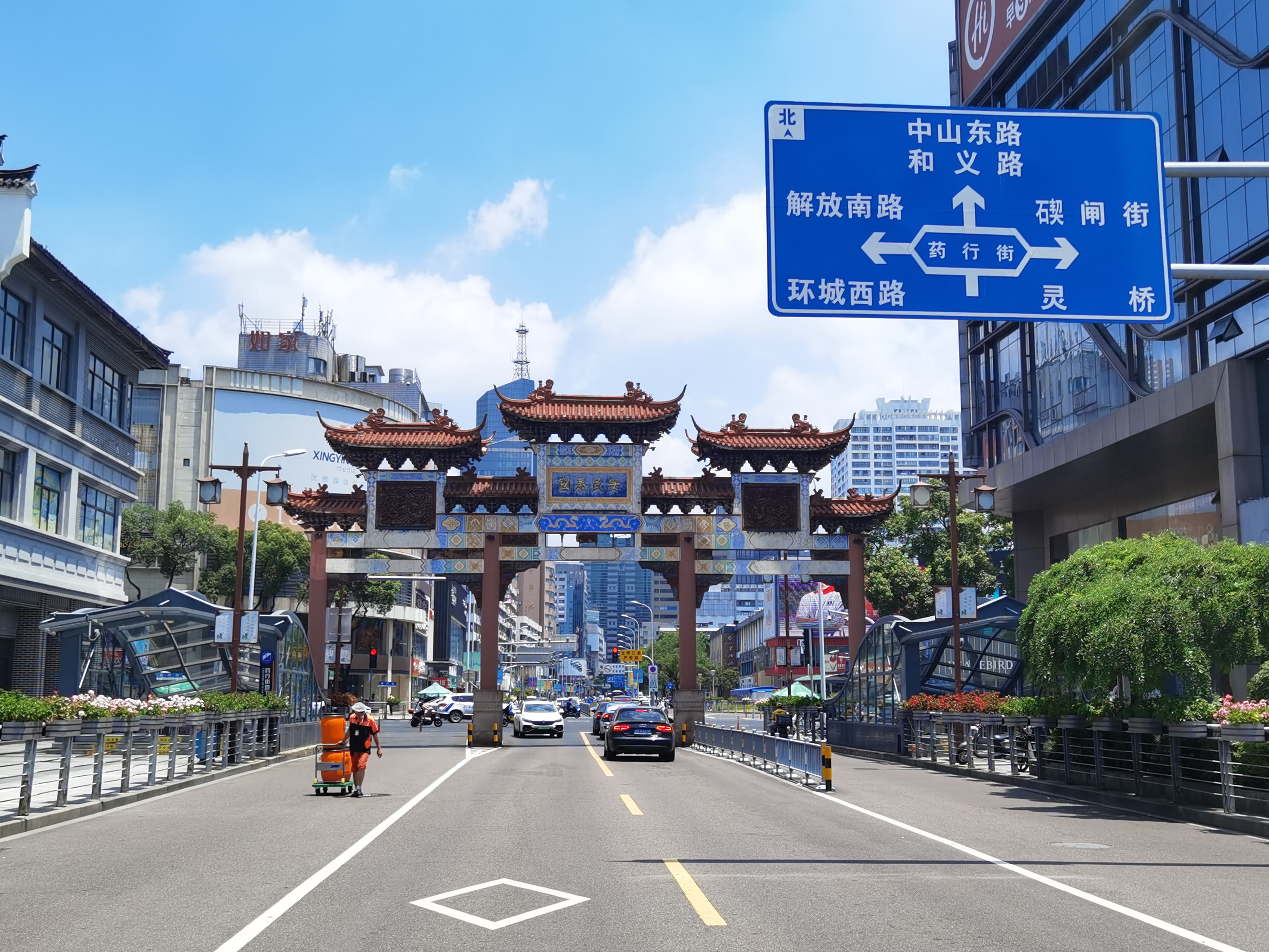 城隍廟牌坊位于寧波市城隍廟開明街與藥行街交叉口,始建于1988年,牌坊整體南北向,四柱三間開,總長20米,高12.5米。作為漢族特色建筑文化之一,城隍廟牌坊是城隍廟商業(yè)街的標(biāo)志性建筑和門戶,見證著我市發(fā)展與建設(shè)的有機(jī)更新。