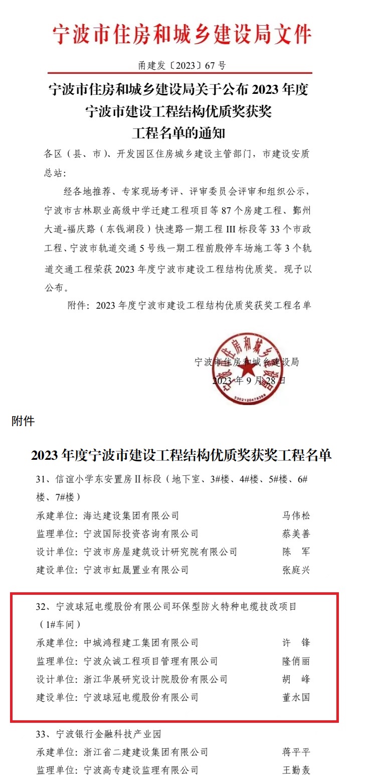 近日,寧波市住房和城鄉(xiāng)建設(shè)局公布了《2023年度寧波市建設(shè)工程結(jié)構(gòu)優(yōu)質(zhì)獎》項目名單,眾誠工程公司監(jiān)理的“寧波球冠電纜股份有限公司環(huán)保型防火特種電纜技改項目 (1#車間)”工程榜上有名。